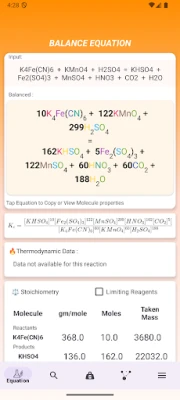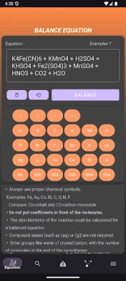 A Chemical Equation Balancer átfogó megoldást kínál minden kémiai problémára. Egyensúlyozzon kémiai egyenleteket, keressen 12000 reakció között, és használjon moláris tömeg és oxidációs szám számológépet. Segít a házi feladatban, a vegyianyag-szükséglet kiszámításában és a periódusos rendszer böngészésében. Ideális a kémia tanulásához és gyakorlásához.