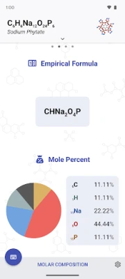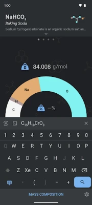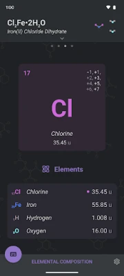Főbb jellemzői a molekuláris tömeg azonnali meghatározása, a vegyületek százalékos összetételének precíz analízise, és az empirikus képletek könnyed kiszámítása. Emellett részletes információkat kaphat az egyes elemekről, és ellenőrizheti az anyagok vízben való oldhatóságát. Az alkalmazás különlegessége a speciálisan tervezett billentyűzet, amely nagymértékben leegyszerűsíti a komplex kémiai képletek bevitelét. Kereshet vegyületek között név (pl. víz) vagy kémiai képlet (pl. H₂O) alapján, így a kívánt adatok pillanatok alatt elérhetővé válnak.