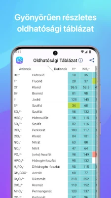 Az alkalmazás nem merül ki az elméleti segítségnyújtásban. A beépített moláris tömeg kalkulátor pillanatok alatt meghatározza bármely vegyület moláris tömegét és az elemek százalékos arányát, pusztán a képlet pontos bevitelével. Ez a praktikus funkció kiegészíti a számtalan egyéb hasznos táblázatot, mint például a saverősségi lista, az elemek standard elektródpotenciáljai és a savak, anionok, sók átfogó listája. A Kémia alkalmazás sötét móddal is rendelkezik, ami kíméli a szemet és elősegíti a koncentrációt. Egy ilyen átfogó és felhasználóbarát eszközzel a hagyományos tankönyvek feleslegessé válnak, minden kémiai tudás egyetlen kézreálló helyen összpontosul.
