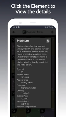 A kémia lenyűgöző világának felfedezése még sosem volt ilyen egyszerű és intuitív! A Periodic Table alkalmazás átfogó digitális enciklopédiaként szolgál, amely a periódusos rendszer minden egyes elemét a tenyerébe adja. Merüljön el az elemek részletes adataiban, vagy tekintse át a teljes rendszert egy pillantással. Akár alapvető információkra van szüksége, akár mélyebb betekintést keres, a Periodic Table gondoskodik róla. Testreszabható nézetekkel és kényelmes világos és sötét móddal biztosítja a tökéletes felhasználói élményt minden körülmények között.