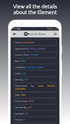 A Periodic Table App segítségével részletesen felfedezheti a periódusos rendszer elemeit. Nézze meg az atomtömeget, forráspontot, kategóriát, vagy épp az elektronszerkezetet. Böngésszen gömb, spirál vagy rács nézetben, tájképi módban. Éjszakai használatra sötét mód is elérhető.